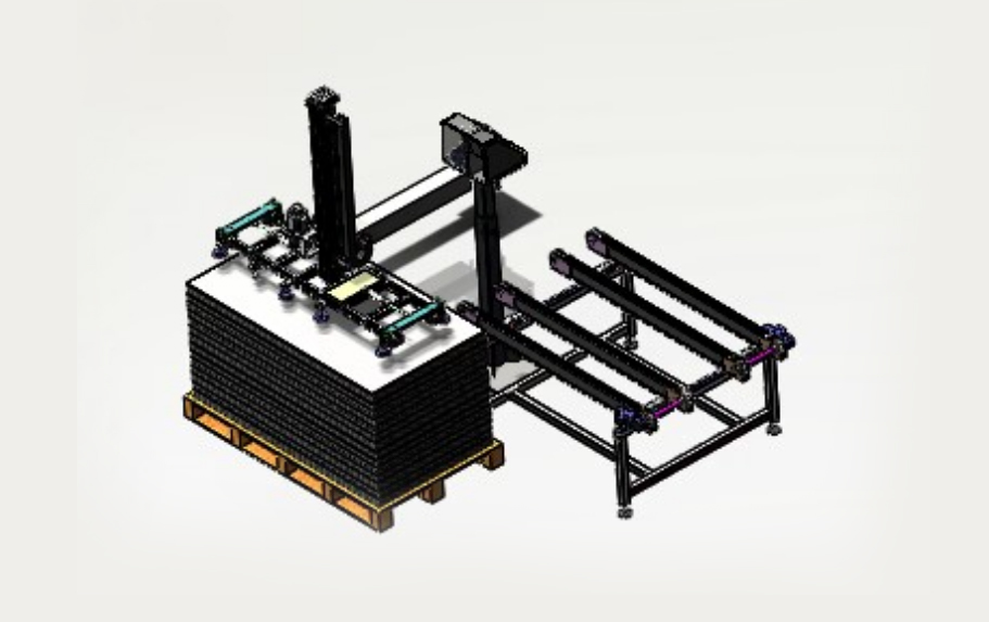自動排版機的主要功能單元有:玻璃輸送定位系統(tǒng)、抓取行走系統(tǒng)、視覺檢測系統(tǒng)、電控系統(tǒng)等;通過以上功能單元,實現(xiàn)了將自動串焊機串焊好的電池串,按照工藝尺寸要求和排版方向順序自動排版鋪設到玻璃(EVA已經鋪設)上,組成電池串陣列。玻璃/EVA通過傳輸線傳輸至指定位置,機械手抓取電池串實現(xiàn)CCD定位、自動旋轉、自動排版功能。設備通過同步帶傳輸與自動生產線對接,實現(xiàn)了自動流水作業(yè)。